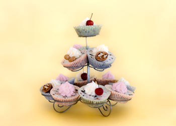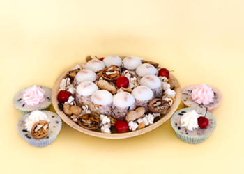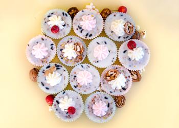 Rijk gevulde vogelcupcake’s afgewerkt met een halve walnoot een Malus appeltje en een pinda.